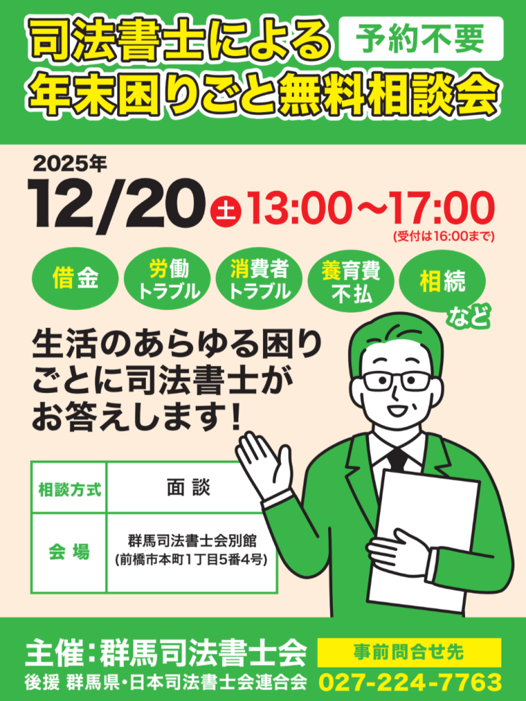 令和7年12月20日 群馬司法書士会にて『年末困りごと無料相談会』が開催されます。